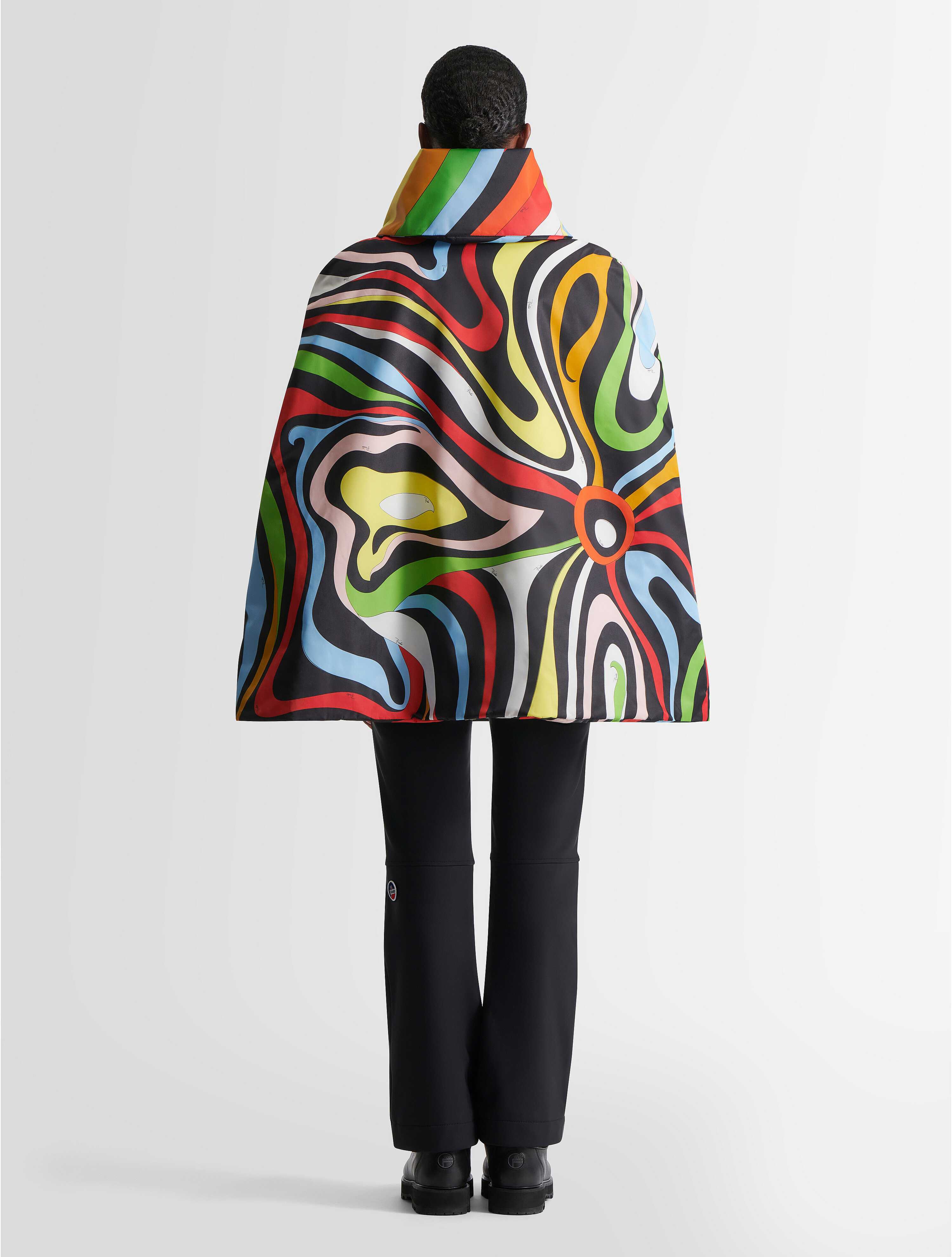 Zélie Cape Greift Mit Dem Marmo Multicolor Pucci All-Over-Print Eine Starke Inspiration Aus Den Siebzigern Auf. Im Gegensatz Dazu Ist Der Unterkragen Mit Dem Mehrfarbigen Iride-Allover-Print Versehen. Hergestellt Aus 100 % Nylon-Außenmaterial Mit Hochleistungs-Dwr – Dauerhaft Wasserabweisend – Und Mit Weichem Schwarzem Fleece Gefüttert, Das Den Komfort Und Die Wärme Erhöht. Das Armscye Ist Mit Einer Passenden Paspelierung Versehen. Der Hohe Kragenverschluss Ist Mit Schwarzen Druckknöpfen Mit Doppeltem Fischlogo Verziert, Die Auf Puccis Starke Verbundenheit Mit Dem Meer Hinweisen, Und Das Exklusive Gestickte Logo-Abzeichen Der Zusammenarbeit Ziert Die Linke Schulter.