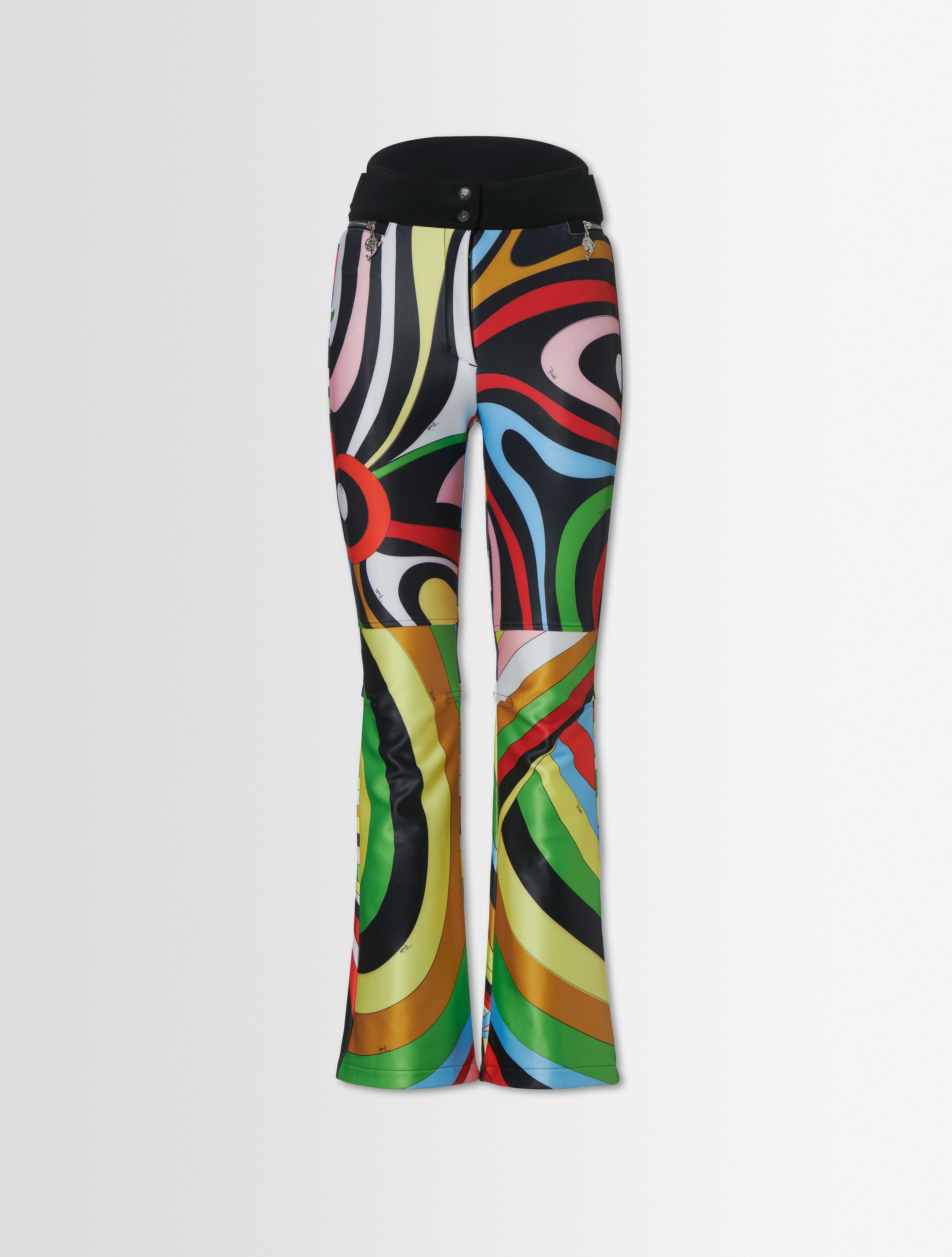 Elancia Pucci Skihosen Sind Aus Mehrfarbigem Marmo Pucci Und Mehrfarbigem, Durchgehend Bedrucktem, Winddichtem Schoeller® Softshell-Stretch-Bonded-Fleece Gefertigt. Der Zeitgemäße, Sportlich-Schicke Stil Und Die Schmal Geschnittene Skihose Sorgen Für Eine Schlanke Silhouette. Sie Verfügen Über Einen Hohen Bund Mit Verstelllaschen Und Vorgeformte Knie. Die Horizontalen Hüfttaschen Unter Dem Bund Sind Mit Puccis Charakteristischem Silberfarbenen, Fischförmigen Juwelenzieher Verziert, Alle Reißverschlüsse Ebenfalls. Der Vordere Hosenschlitz Ist Mit Dem Schwarzen Druckknopf Mit Pucci Fish-Logo Verziert. Das Charakteristische, Exklusive Gestickte Logo-Abzeichen Von Pucci